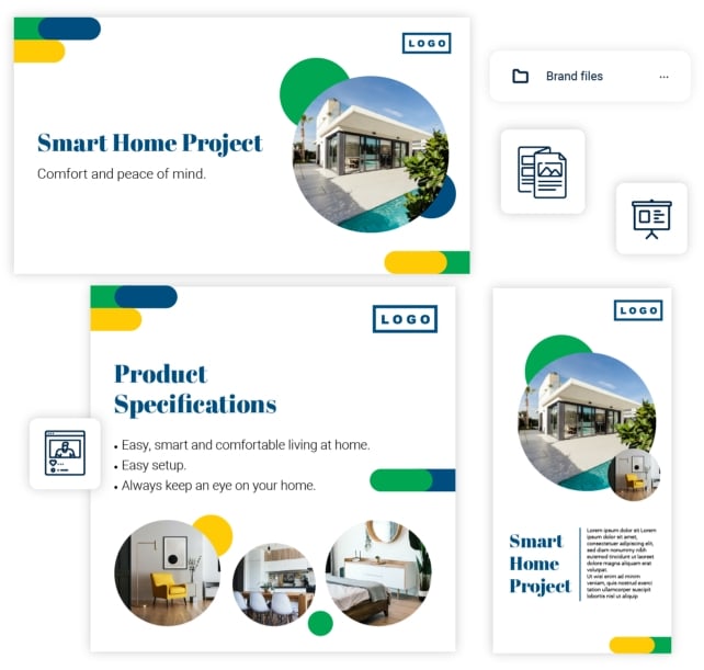 Make your brand memorable, without having to think about it. Create replicable templates with your logos, fonts, brand colors, and dimensions.